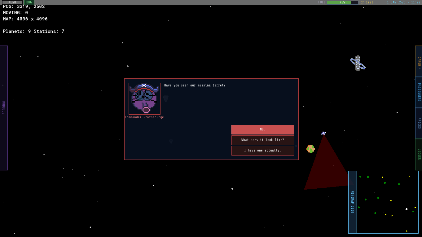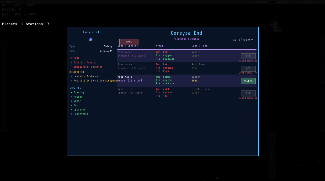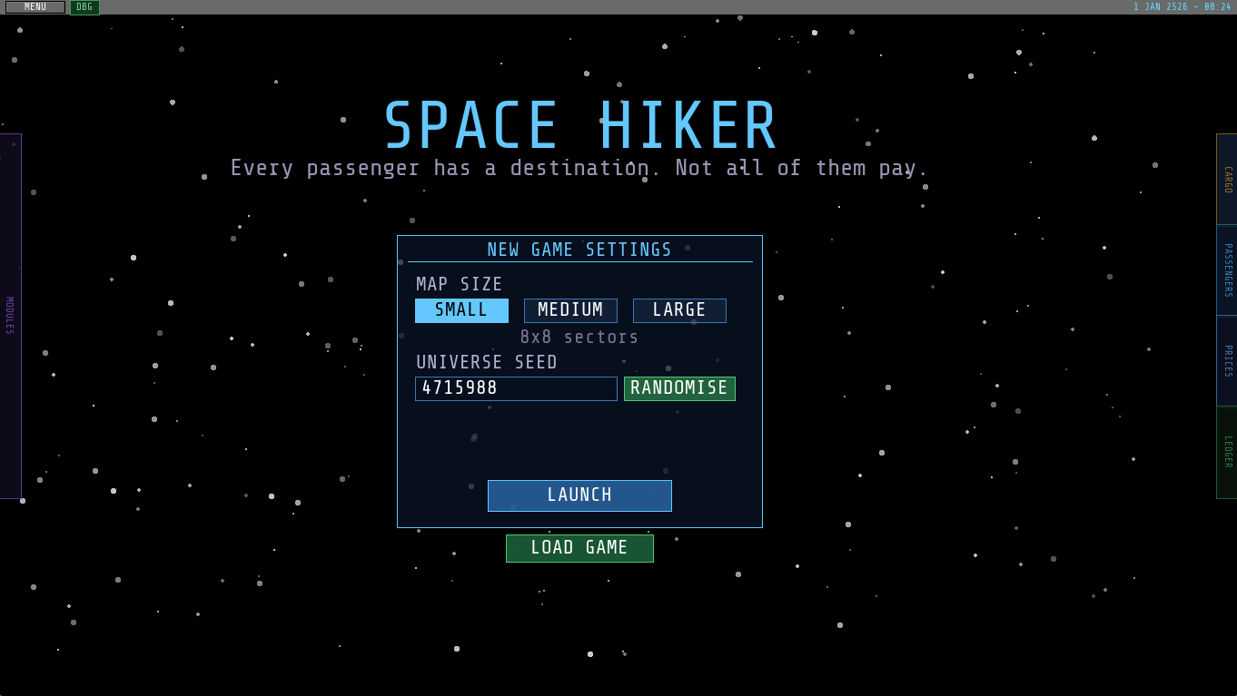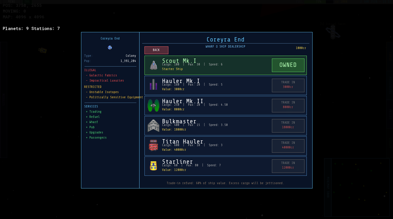 Space Hiker is a laid-back space trading game with a weight problem — specifically, the 20,000 credit weight of a loan you didn't ask for. Hop between planets and stations, buy low, sell high, and build a fortune one questionable cargo manifest at a time.